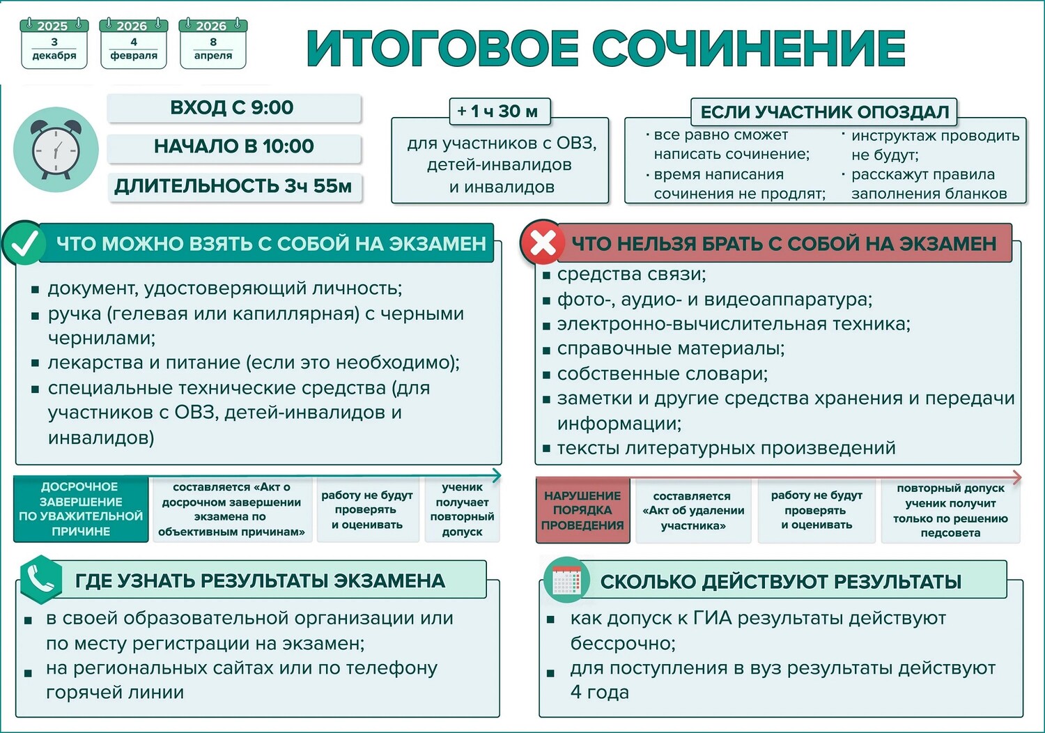 Сами темы сочинений станут известны выпускникам за 15 минут до начала экзамена. Результатом итогового сочинения (изложения) будет «зачет» или «незачет», однако к сдаче единого государственного экзамена и государственного выпускного экзамена допустят только выпускников, получивших «зачет».